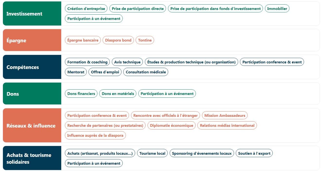 Notre catalogue propose 16 domaines d’action et 35 façons de contribuer, allant de l’investissement et l’épargne aux compétences, dons, réseaux, influence, et tourisme solidaire.